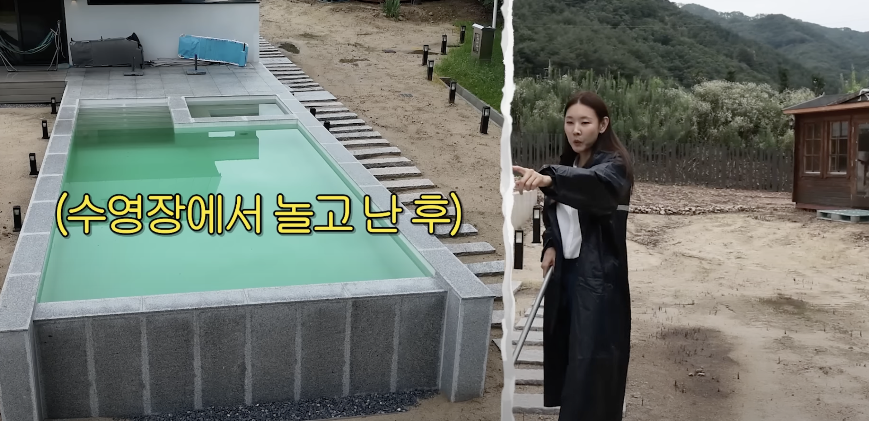 야외 수영장은 현재 개구리들의 놀이터로 변모했습니다. 잦은 비로 물이 고여 올챙이 서식지가 되었고, 밤에는 개구리 소음 때문에 잠을 설칠 정도라고 합니다. 이는 전원생활에서 흔히 겪는 문제점으로, 야생동물과의 공존은 생각보다 쉽지 않습니다.